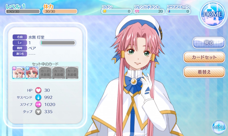 「水無灯里」ら人気キャラクターにカードをセット、最大5枚までのカードをセットしてステータスを強化します。